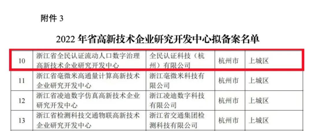 憑借卓越的自主研發(fā)創(chuàng)新能力,成效顯著的科技成果轉(zhuǎn)化實(shí)力和完善的研發(fā)管理體系,經(jīng)浙江省科學(xué)技術(shù)廳評(píng)審、公示,全民認(rèn)證科技(杭州)有限公司的“浙江省全民認(rèn)證流動(dòng)人口數(shù)字治理高新技術(shù)企業(yè)研究開(kāi)發(fā)中心”被認(rèn)定為2022年省高新技術(shù)企業(yè)研究開(kāi)發(fā)中心。