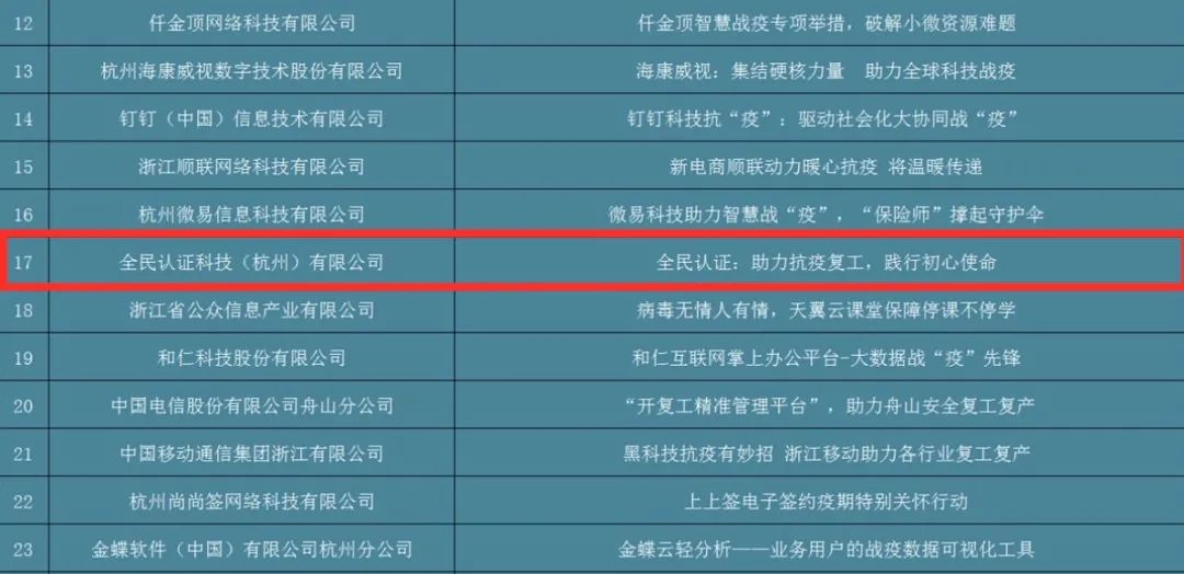 全民認(rèn)證入選了2020年由浙江省數(shù)字經(jīng)濟(jì)發(fā)展中心,浙江在線主辦的 “浙江省戰(zhàn)‘疫’基層社會(huì)治理優(yōu)秀案例征集活動(dòng)”。有超過100多家來(lái)自全省知名企事業(yè)單位參與競(jìng)選,通過組委會(huì)初步篩選,線上展示,網(wǎng)友點(diǎn)贊等環(huán)節(jié),最終通過專家評(píng)審小組分組評(píng)分,確定了30個(gè)獲獎(jiǎng)案例進(jìn)行表彰。