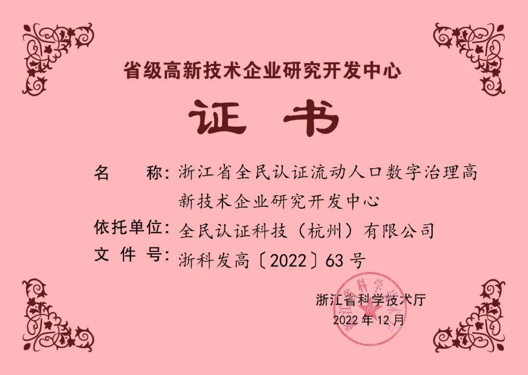 · “全民認證流動人口數(shù)字治理研發(fā)中心” 評為流動人口數(shù)字治理領(lǐng)域省級高新技術(shù)企業(yè)研究開發(fā)中心