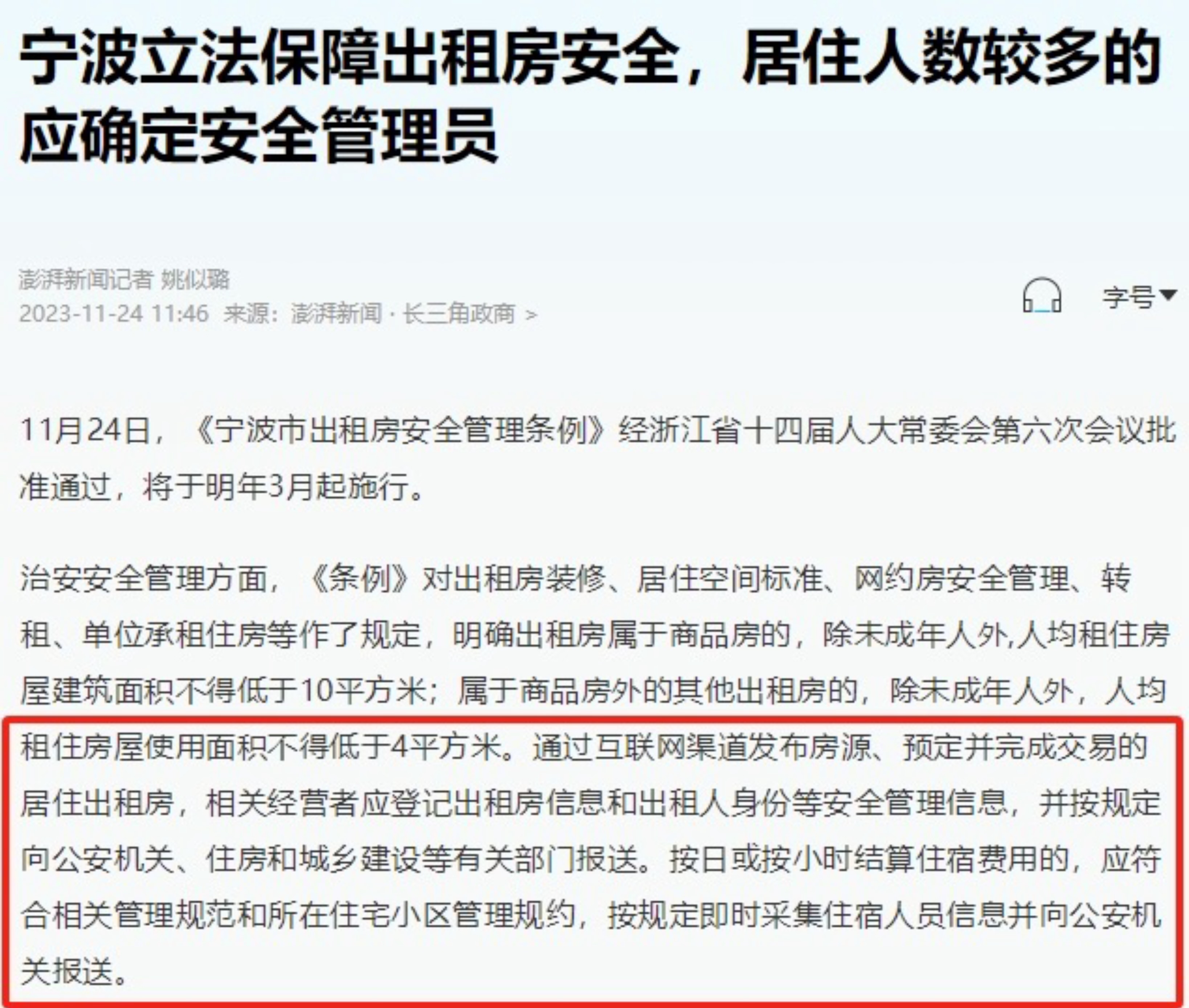 11月24日,《寧波市出租房安全管理?xiàng)l例》經(jīng)浙江省十四屆人大常委會(huì)第六次會(huì)議批準(zhǔn)通過,將于明年3月起施行。