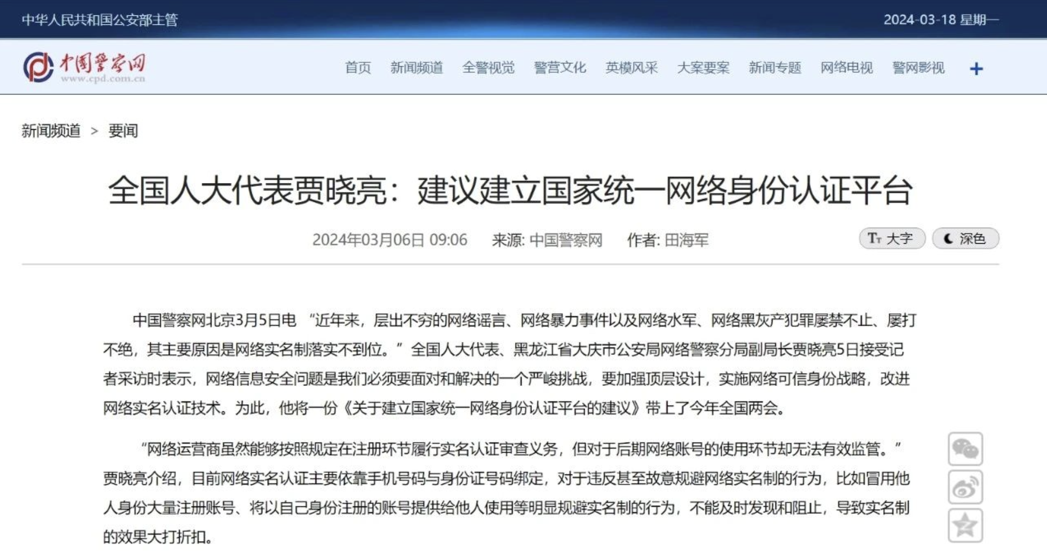 在數(shù)字化浪潮席卷全球的今天,網(wǎng)絡(luò)信息安全問題日益凸顯,網(wǎng)絡(luò)謠言、網(wǎng)絡(luò)暴力以及網(wǎng)絡(luò)黑灰產(chǎn)犯罪等問題層出不窮。近日,全國人大代表、黑龍江省大慶市公安局網(wǎng)絡(luò)警察分局副局長賈曉亮在接受記者采訪時表示,這些問題的根源在于網(wǎng)絡(luò)實(shí)名制落實(shí)不到位,因此加強(qiáng)頂層設(shè)計(jì),實(shí)施網(wǎng)絡(luò)可信身份戰(zhàn)略,改進(jìn)網(wǎng)絡(luò)實(shí)名認(rèn)證技術(shù)成為當(dāng)下迫切需求。