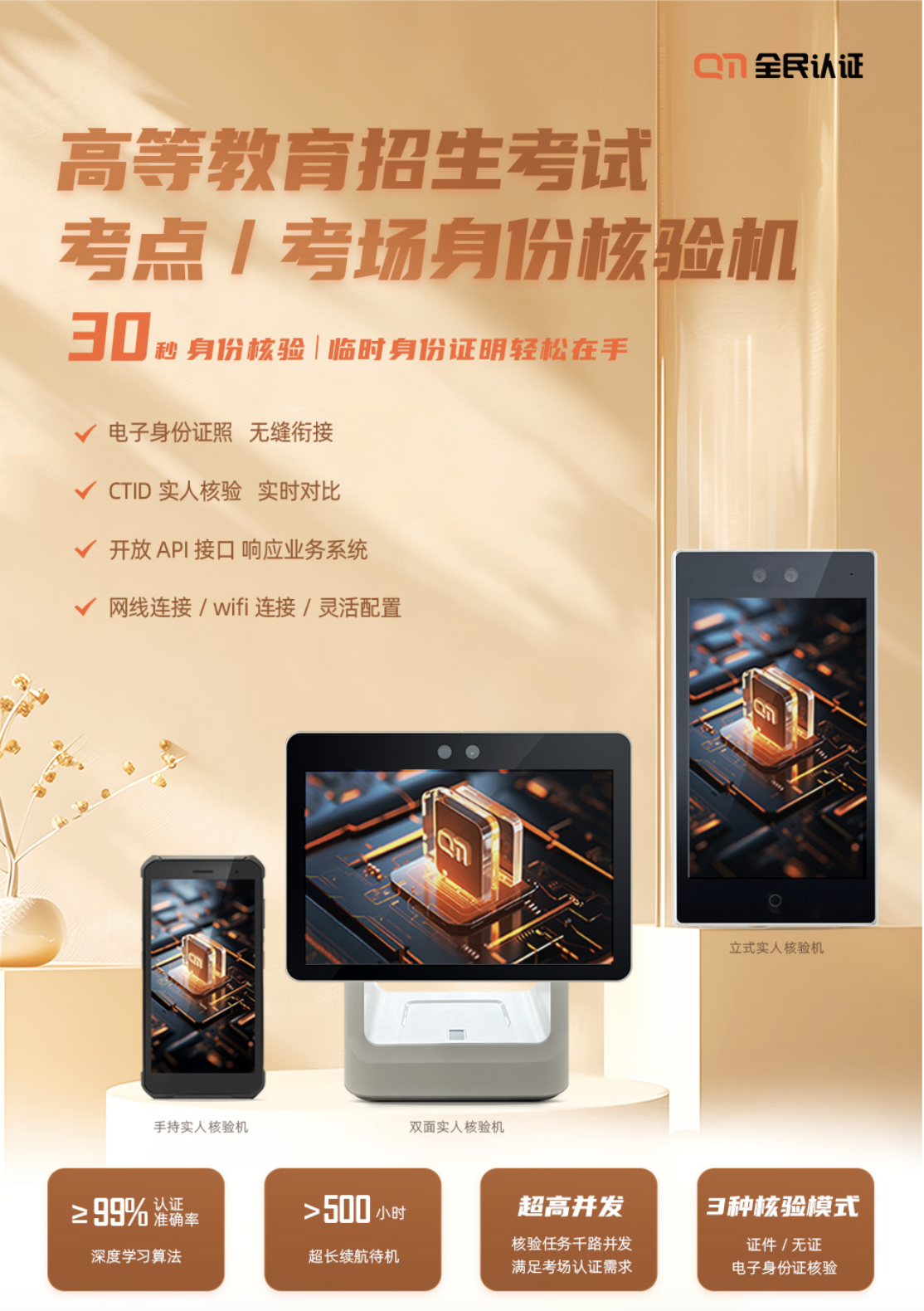 為從根源上解決替考等違規(guī)行為的發(fā)生,全民認(rèn)證創(chuàng)新探索數(shù)字身份在教育考試場(chǎng)景的管理應(yīng)用,打造“高等教育招生考試,考點(diǎn)、考場(chǎng)身份核驗(yàn)解決方案”,以智能化身份識(shí)別終端設(shè)備為載體,結(jié)合大數(shù)據(jù)及生物識(shí)別技術(shù),為考生身份核驗(yàn)提供更權(quán)威、更高效、更安全的手段,有效解決人工核驗(yàn)不準(zhǔn)確、工作量大、標(biāo)準(zhǔn)不統(tǒng)一、核驗(yàn)工作效率低等痛點(diǎn)問(wèn)題,嚴(yán)防冒名頂替。