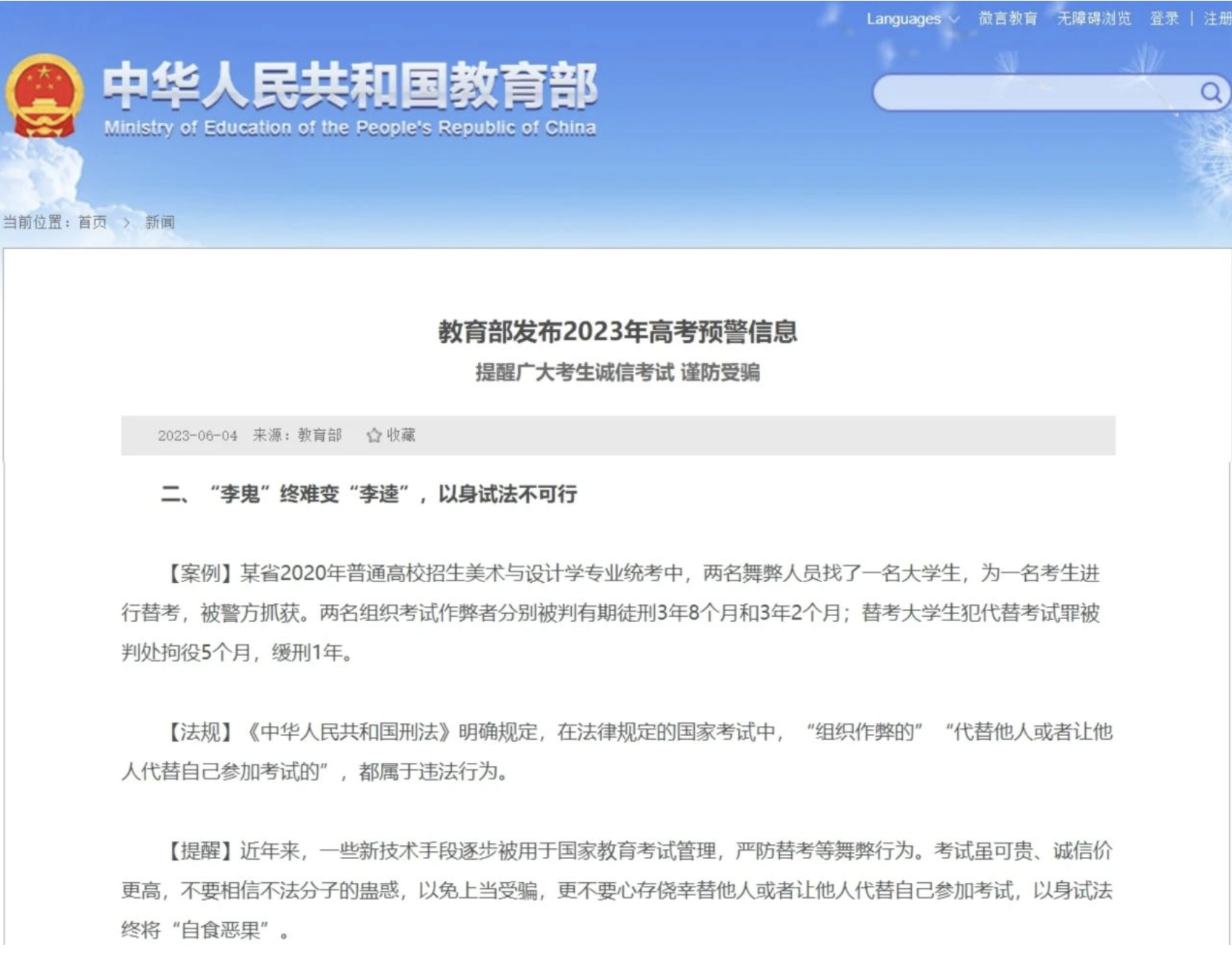 “2023年,教育部發(fā)布高考預(yù)警信息,其中公布一起案例,某省2020年普通高校招生美術(shù)與設(shè)計(jì)學(xué)專(zhuān)業(yè)統(tǒng)考中,兩名舞弊人員找了一名大學(xué)生,為一名考生進(jìn)行替考,被警方抓獲。兩名組織考試作弊者分別被判有期徒刑3年8個(gè)月和3年2個(gè)月;替考大學(xué)生犯代替考試罪被判處拘役5個(gè)月,緩刑1年?!?/span>