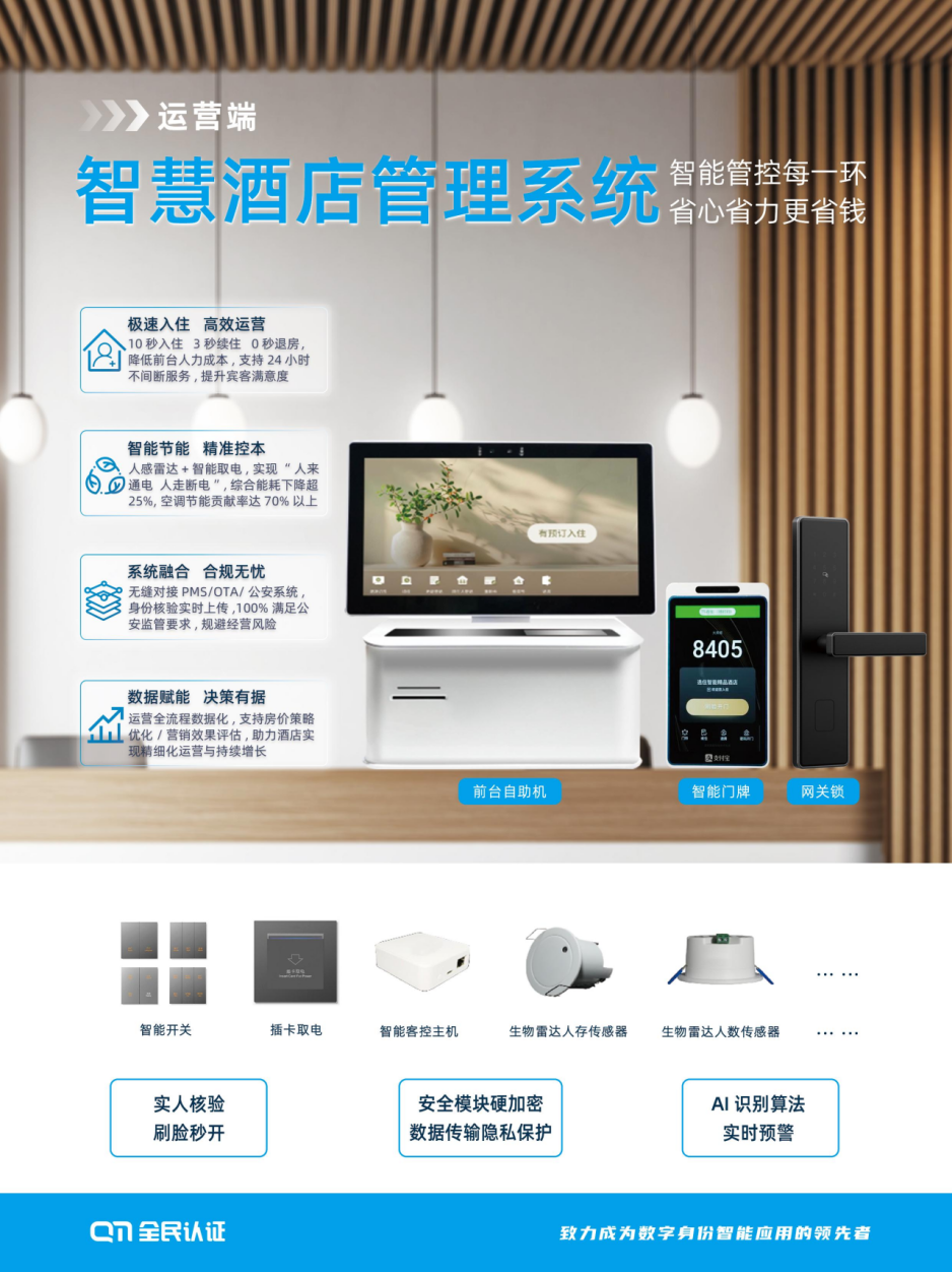 全民認(rèn)證智慧酒店解決方案,以全流程自助化、系統(tǒng)智能聯(lián)動、精準(zhǔn)能耗控制與數(shù)據(jù)驅(qū)動運營為核心,全面賦能酒店實現(xiàn)運營效率提升、人力與能耗成本下降、合規(guī)管理強化及賓客體驗升級,是酒店實現(xiàn)數(shù)字化轉(zhuǎn)型、構(gòu)建未來競爭力的可靠伙伴。