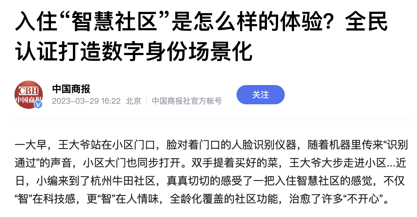 以往智慧社區(qū)使用的智能設備都通過物與物的聯(lián)接,實現(xiàn)智能化融合應用,對于用戶來說是看不見摸不著的。而在牛田社區(qū),全民認證讓用戶真實感受到了智慧社區(qū)的概念,那就是用“數(shù)字身份認證”使建筑物和建筑物之間、設備與設備之間形成了一條無形的聯(lián)接,真正實現(xiàn)了“一臉通行”的目標,從小區(qū)大門延伸到了主戶家門口,讓居民們發(fā)現(xiàn)原來虛擬空間的數(shù)字身份可以在現(xiàn)實社會得到運用,智慧社區(qū)的智能化運用也有了更好的使用體驗。