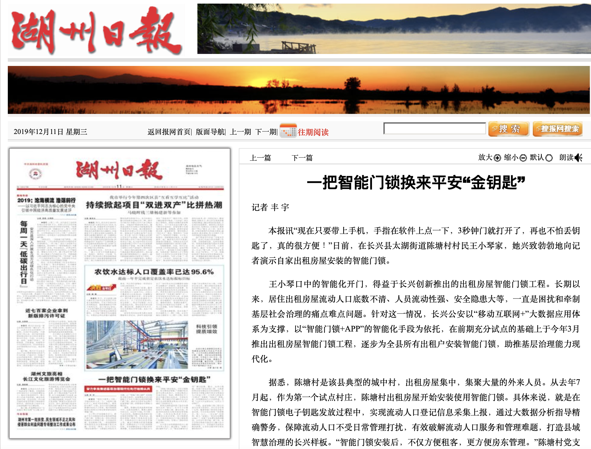 12月11日湖州日報頭版發(fā)文《一把智能門鎖換來平安“金鑰匙”》,報道長興縣出租房屋智能門鎖工程的顯著成果,在全民認證科技(杭州)有限公司的大力配合下,該縣智能門鎖工程已經(jīng)成為全省示范項目,并已在全市推廣應用。